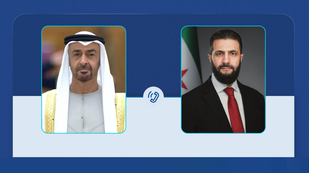 أكد الرئيس أحمد الشرع في اتصال هاتفي اليوم الأحد، مع الشيخ محمد بن زايد آل نهيان، رئيس دولة الإمارات العربية المتحدة الشقيقة تضامن الجمهورية العربية السورية مع دولة الإمارات العربية المتحدة حيال الاعتداءات التي استهدفت أراضيها وعدداً من الدول الشقيقة.