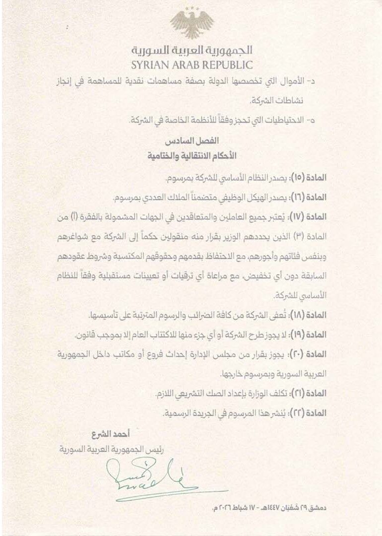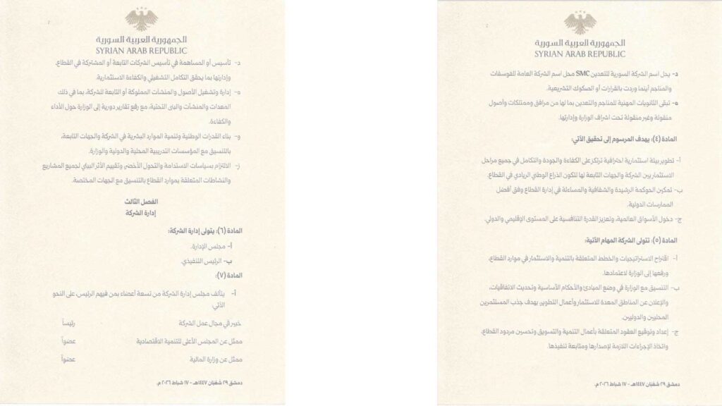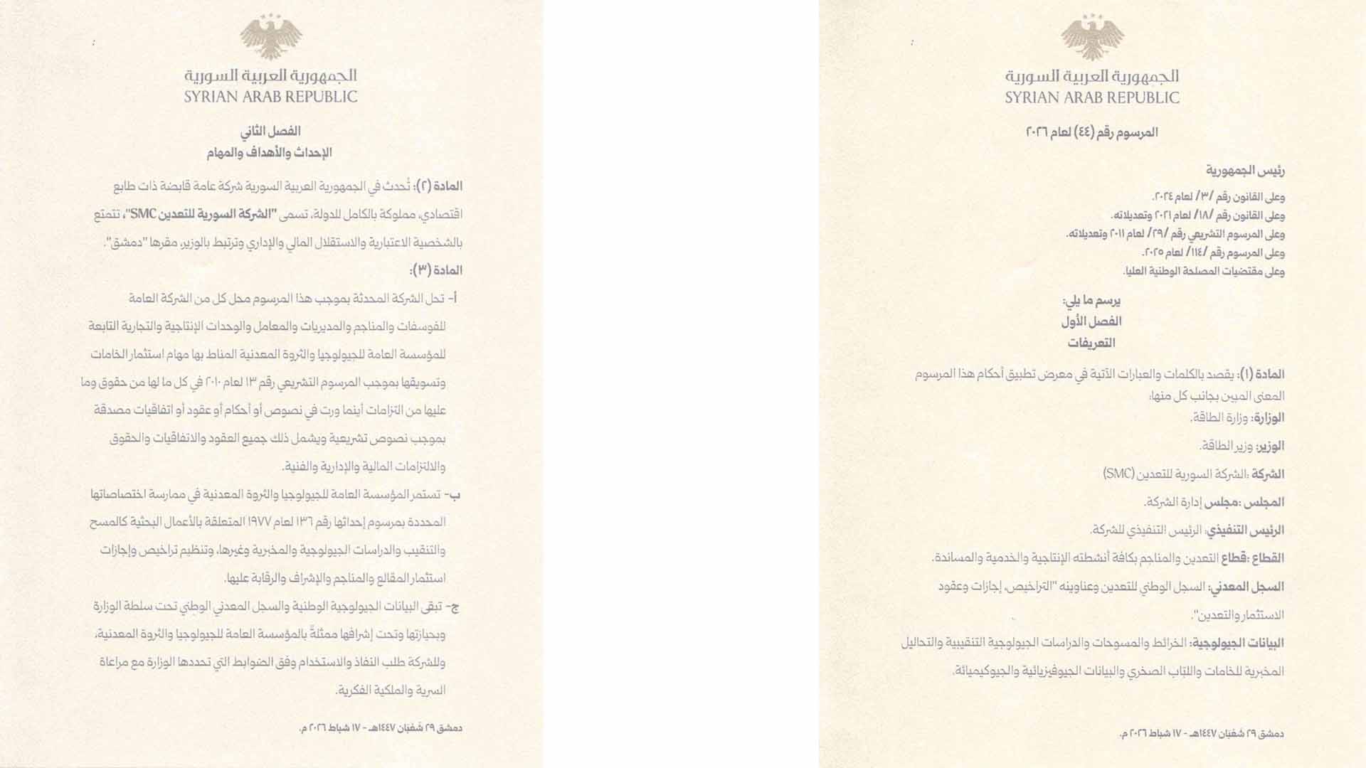 أصدر رئيس الجمهورية العربية السورية، أحمد الشرع، المرسوم رقم /44/ لعام 2026، القاضي بتأسيس “الشركة السورية للتعدين (SMC)” كشركة عامة قابضة ذات طابع اقتصادي مملوكة بالكامل للدولة، تتمتع بالشخصية الاعتبارية والاستقلال المالي والإداري، وترتبط بوزير الطاقة ومقرها دمشق.