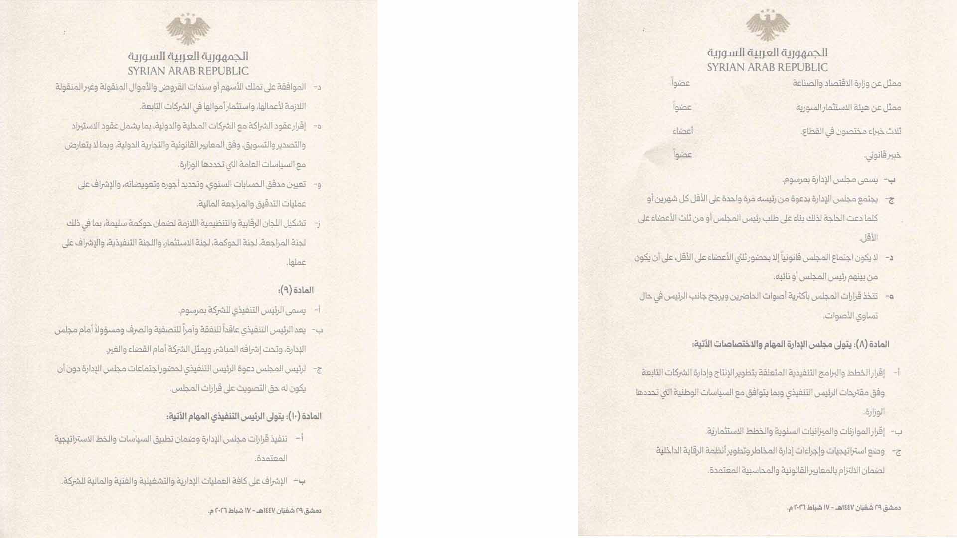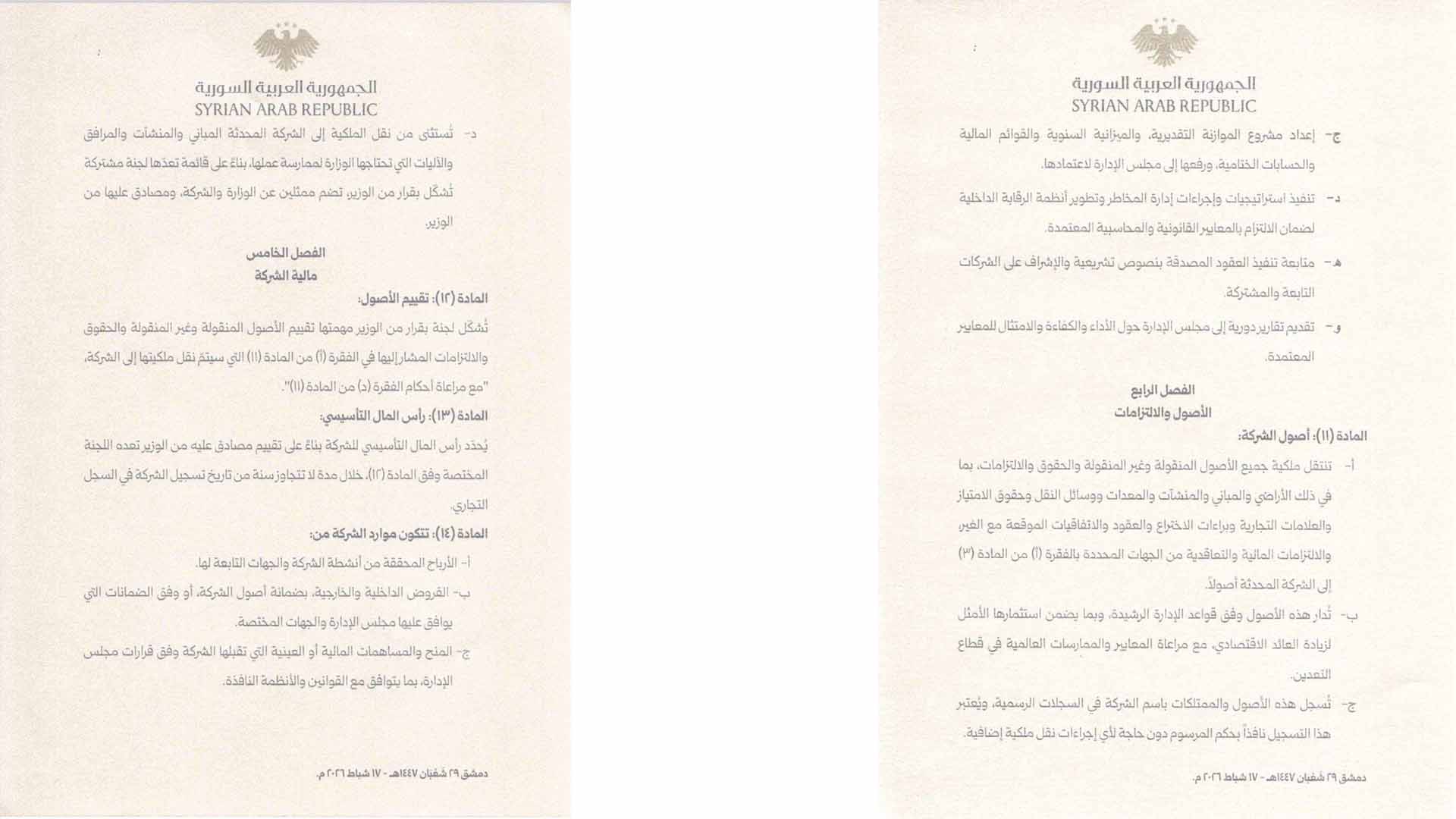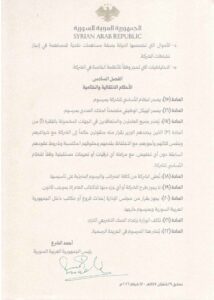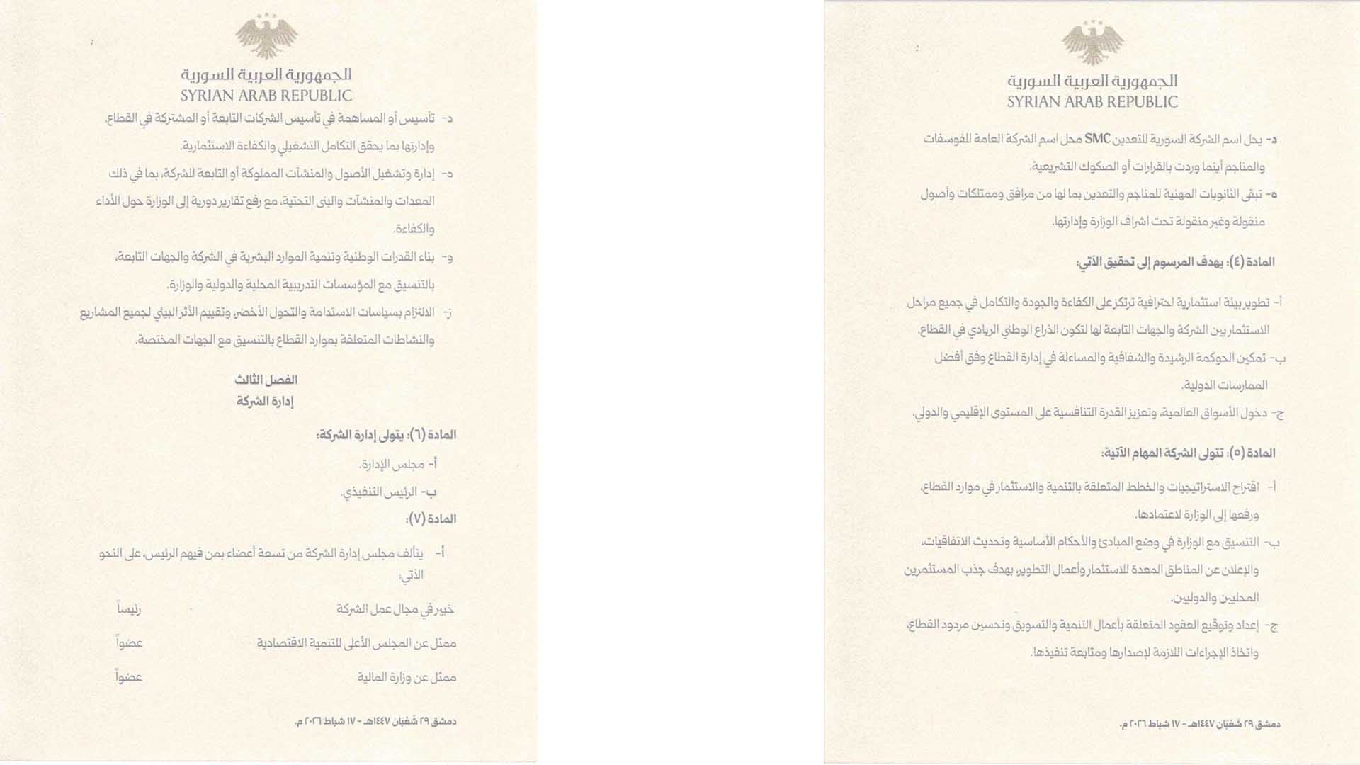 أصدر رئيس الجمهورية العربية السورية، أحمد الشرع، المرسوم رقم /44/ لعام 2026، القاضي بتأسيس “الشركة السورية للتعدين (SMC)” كشركة عامة قابضة ذات طابع اقتصادي مملوكة بالكامل للدولة، تتمتع بالشخصية الاعتبارية والاستقلال المالي والإداري، وترتبط بوزير الطاقة ومقرها دمشق.