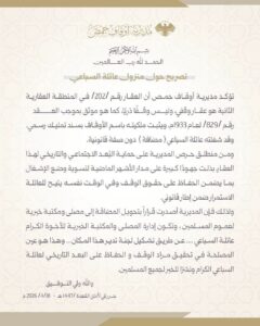 وأكد البيان الذي نشرته المديرية على صفحتها الرسمية “فيسبوك” ، أن العقار رقم /202/ (المنطقة العقارية الثانية) المعروف بـ “منزول عائلة السباعي”، هو عقار وقفي مسجل باسم الأوقاف بسند تمليك رسمي منذ عام 1933، وليس وقفاً ذرياً كما يُشاع، معتبرة إشغال العائلة له حالياً “من دون صفة قانونية”.