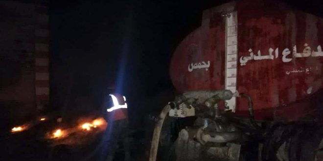 إخماد حريق اندلع على طريق حمص مصياف الليلة الماضية