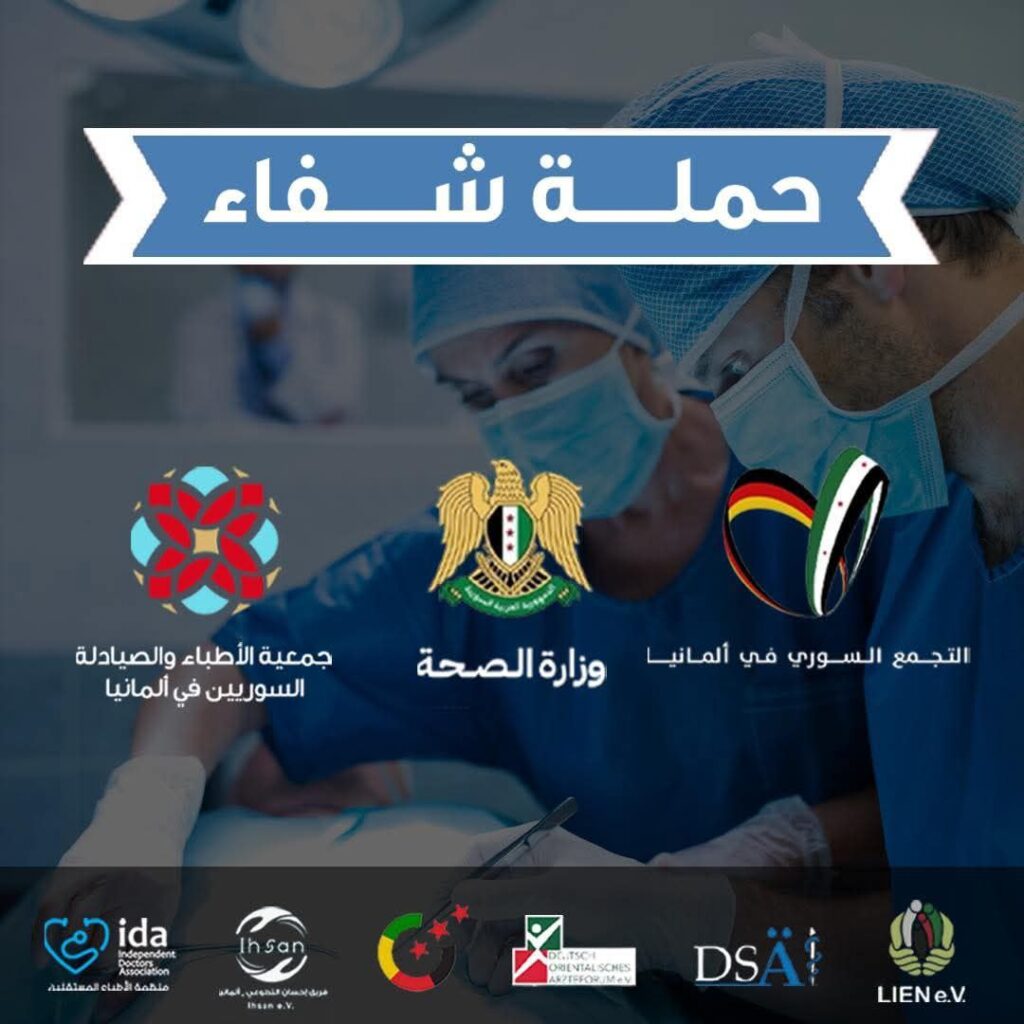 يطلق المكتب الطبي للتجمع السوري في ألمانيا بالتعاون مع جمعية الأطباء و الصيادلة السوريين في ألمانيا والتنسيق مع وزارة الصحة السورية يوم الاثنين القادم فعالية “حملة شفاء-يداً بيد من أجل…