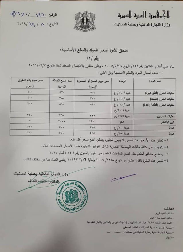 أصدر وزير التجارة الداخلية وحماية المستهلك الدكتور عاطف النداف قرارا حدد بموجبه أسعارا جديدة للخبز…
