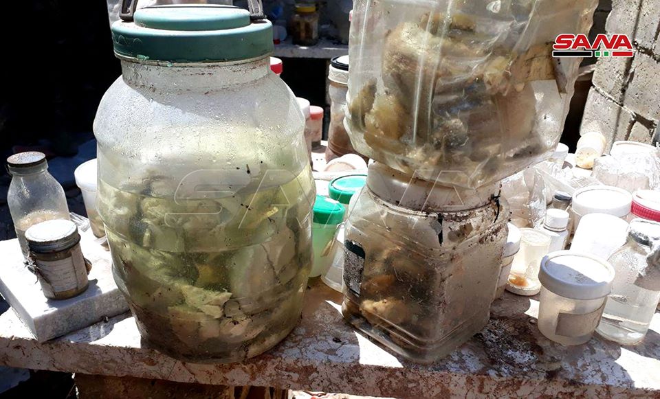 أعضاء بشرية محفوظة بغرض الإتجار داخل أحد أوكار الإرهابيين في قرية الغدفة المحررة بريف إدلب الجنوبي
