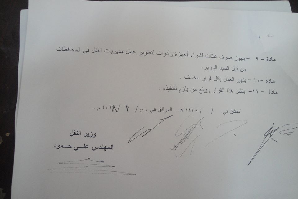 أصدر وزير النقل المهندس علي حمود قرار فرز المهندسين ضمن مجال عمل وزارة النقل.